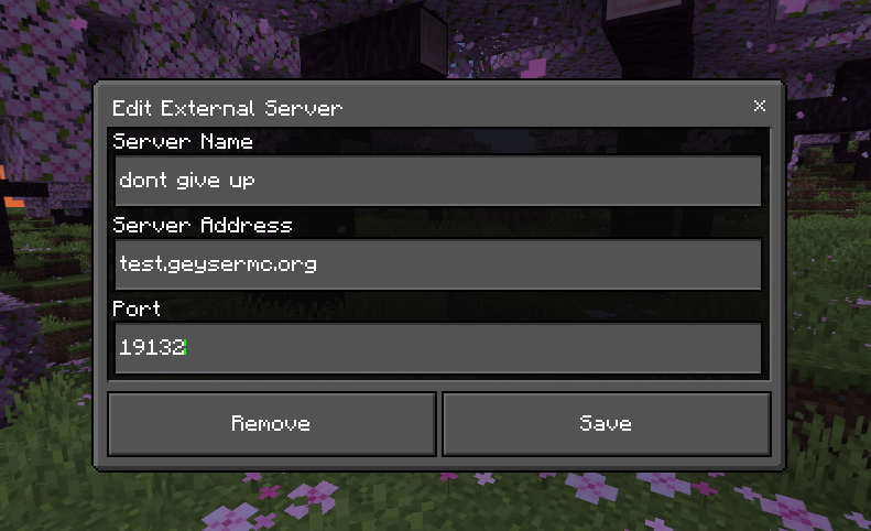 Commonly, people may have issues with Geyser not showing up in their server list or run into similar issues. This page contains a few common issues people may encounter that you might have as well as potential fixes for them. If you still can't make it work, join our Discord for support.